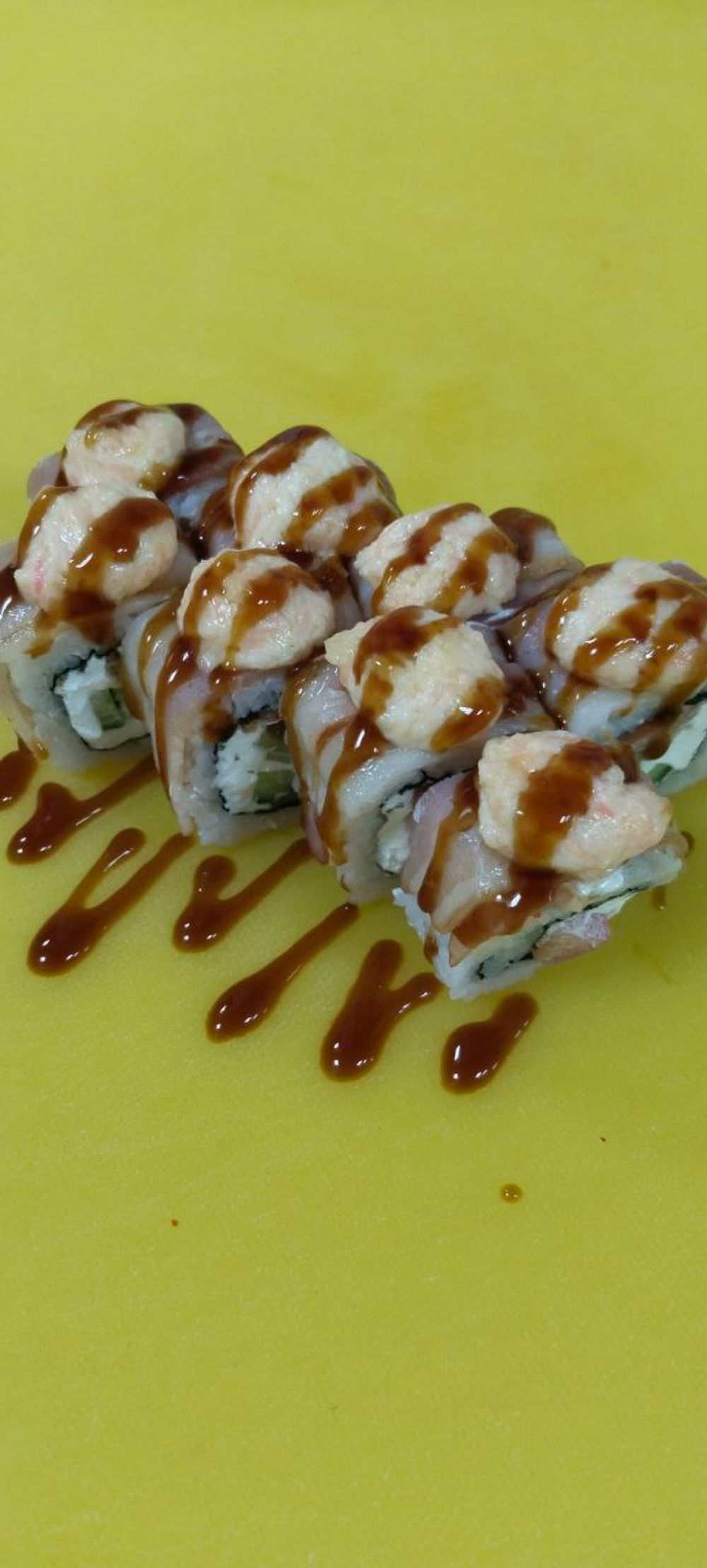 Рис,нори,сыр творожный,помидор,огурец,бекон сверху,сырная шапка,терияки.
