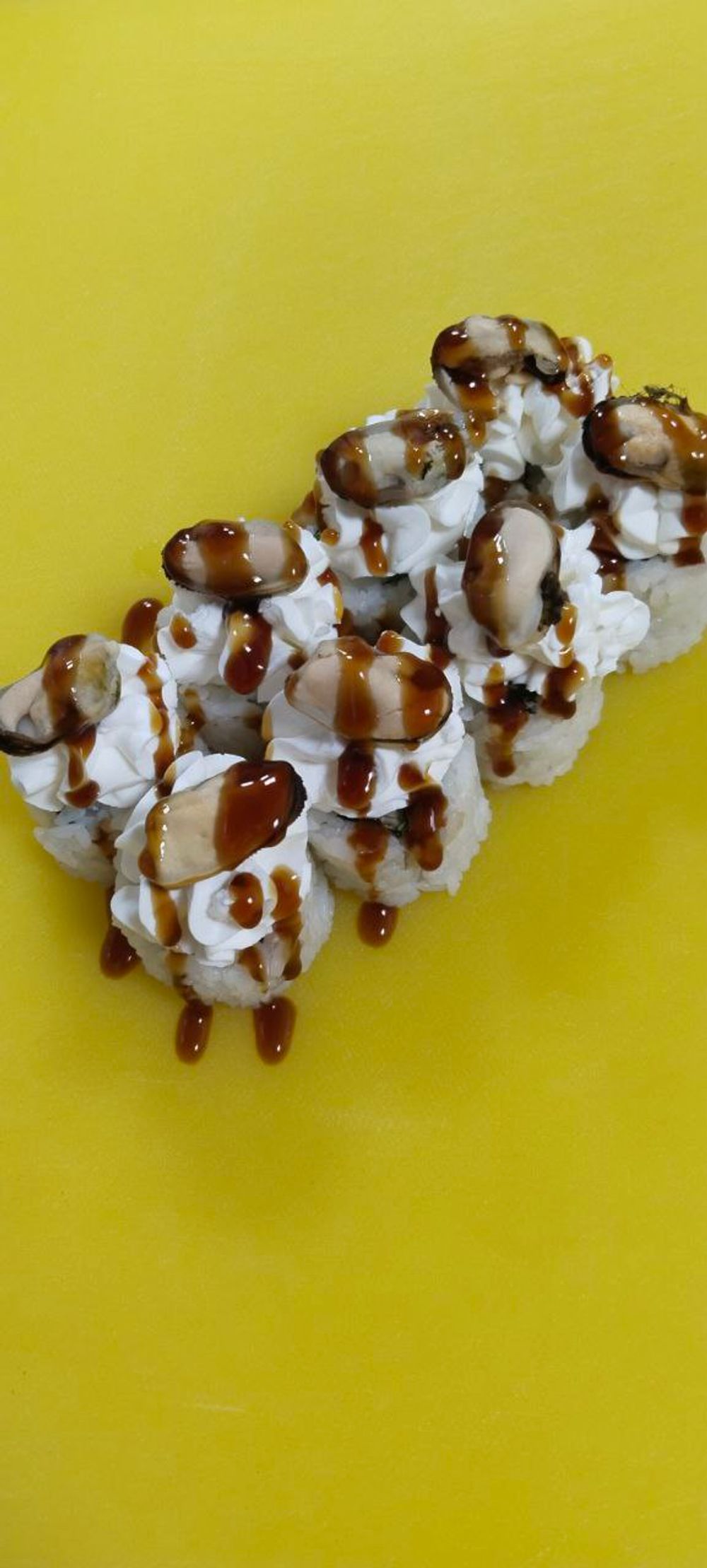 Рис,нори,салат,помидор,помидор,сыр творожный сверху,мидии,терияки.