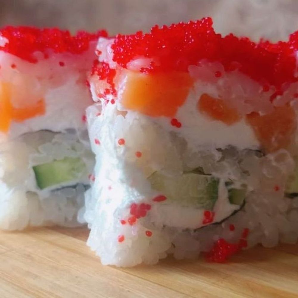 Рис, нори, огурец, лосось, творожный сыр, икра «Тобико»